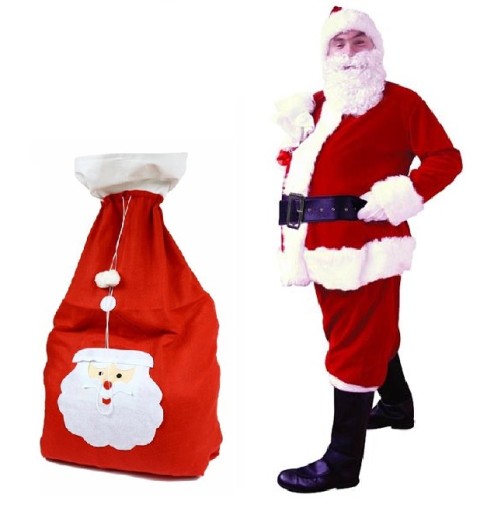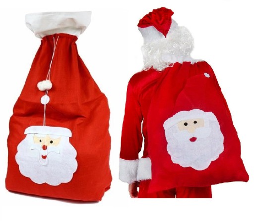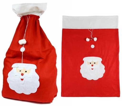 ✅ Duży, szeroki, pojemny worek w kolorze biało-czerwonym, zdobiony naszywką Świętego Mikołaja, posiada sznureczki do ściągnięcia z białymi pomponami