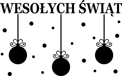 - Wielkość: rozmiary całej naklejki: 45,0 x 28,0 cm; napis WESOŁYCH ŚWIĄT w układzie widocznym na wzorze: 44,5 x 5,8 cm; bombki wraz ze wstążeczkami w rozmiarze 6,7 x 23,0 cm (1 sztuka) i 6,7 x 18,6 cm (2 sztuki); kropeczki śniegu średnica 1,5 cm i 1,0 cm