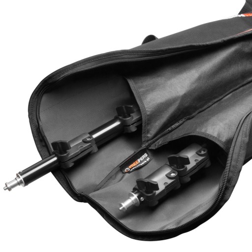 - Pokrowiec bez trudu pomieści łącznie 3 duże statywy, jeden mniejszy oraz 2 parasolki (zobacz zdjęcia przykładowe)