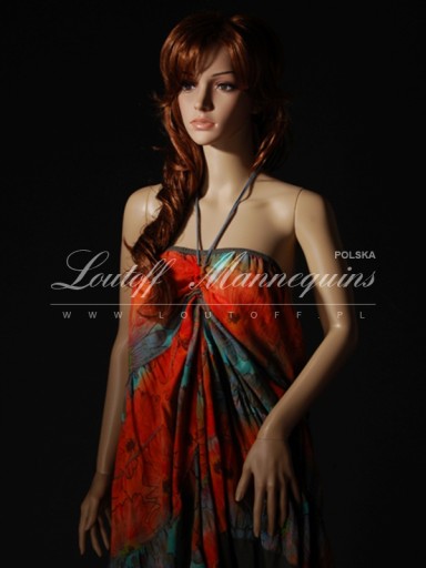 Elegancki manekin damski wraz z peruką, wykonany z tworzywa sztucznego idealnie odwzorowujący szczegóły i detale kobiecej sylwetki wzmocniony nadającym trwałość i odporność podczas eksploatowania.