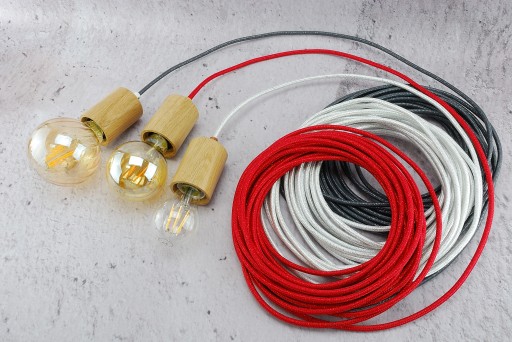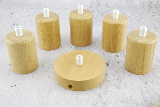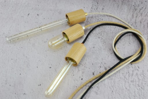 Kupując jedną sztukę otrzymujesz jedną drewnianą osłonkę, jedną oprawkę oraz jedną blokadę przewodu. Przewody, żarówki, podsufitki widoczne na zdjęciach umieszczone są w celu aranżacji, można je zakupić na pozostałych naszych aukcjach.