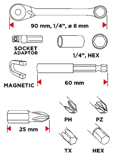 - Końcówki wkrętakowe w zestawie: PH1, PH2x2szt., PZ1, PZ2x2szt., H4, H5, H6, H10, TX15, TX20, TX25, TZ30, TX40