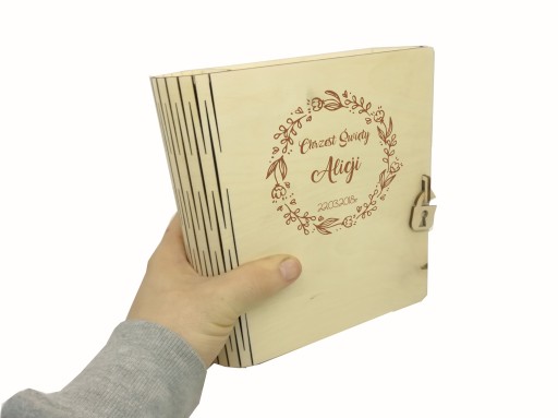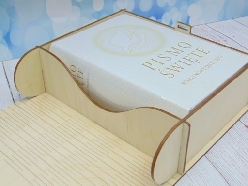 Drewniane pudełko oraz pismo święte z grawerem