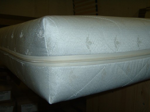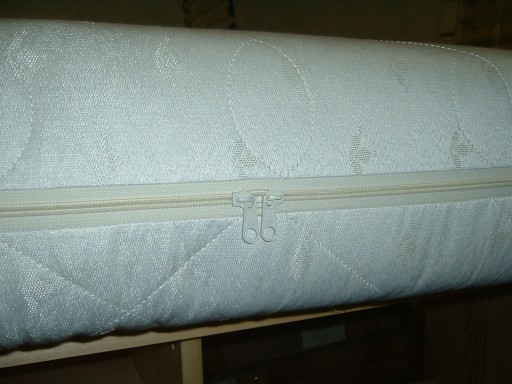 Pokrowiec obszyty jest grubym zamkiem ( 5 mm ) z trzech stron z dwoma suwakami , co ułatwia jego zakładanie na materac.