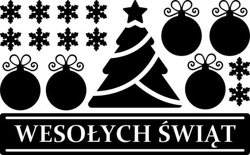 - Ilość: 1 sztuka napisu Wesołych Świąt; 1 sztuka choinki; 10 śnieżynek; 5 sztuk bombek