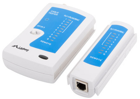 Tester kabli sieciowych Lanberg to wielofunkcyjne urządzenie do testowania przewodów w sieciach telekomunikacyjnych. Urządzenie jest nieodzownym narzędziem każdego instalatora. Pomaga w znaczącym stopniu zaoszczędzić czas w weryfikacji par przewodów sieciowych. Urządzenie głównie służy do pomiaru ciągłości okablowania sieci LAN oraz weryfikacji połączeń wraz z wykrywaniem ewentualnych problemów z zwarciami lub błędnymi połączeniami par. Przy pomocy tego narzędzia można przetestować połączenia przewodów telefonicznych zakończonych złączem RJ-11, skrętek UTP, FTP, SFTP zakończonych wtykami RJ-45 oraz przewody zakończone wtykiem koncentrycznym. Urządzenie składa się z dwóch części, które powinne być mocowane na końcach testowanego przewodu: