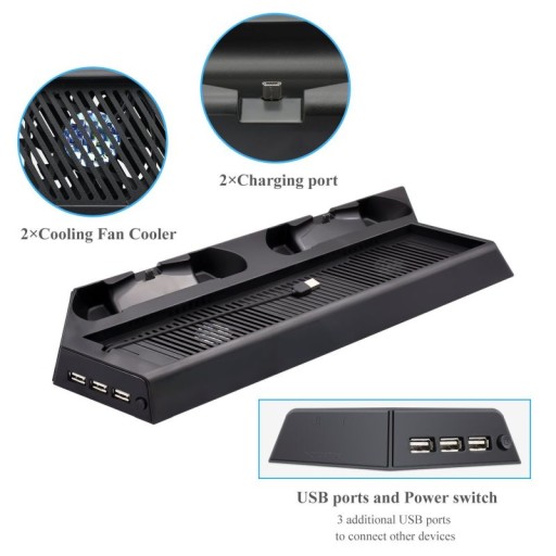 Podstawka umożliwia postawienie konsoli PlayStation 4 PRO na bocznej ściance. Pozwala to na zaoszczędzenie miejsca. Podstawka wykonana jest z mocnego plastiku, dzięki czemu może służyć latami. Stojak wyposażony w 2 wentylatory zapewniające chłodzenie konsoli. Pod stojakiem znajdują się gumki stabilizujące konsolę. Stacja zawiera 2 doki do padów umożliwiające ich ładowanie. Dodatkowo wyposażona jest w 3 porty USB. Produkt jest fabrycznie nowy.