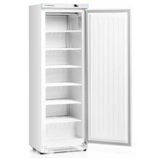Szafa mroźnicza marki Forgast o pojemności 360 l w obudowie lakierowanej na kolor biały. Wnętrze z łatwego w utrzymaniu w czystości tworzywa. W wyposażeniu 6 rusztowych niewyjmowanych półek na produkty o wymiarach 42x36 cm. Chłodzenie statyczne. Drzwi zamykane na zamek. Łatwo wymienna magnetyczna uszczelka drzwi. Brak możliwości zmiany kierunku otwierania drzwi.