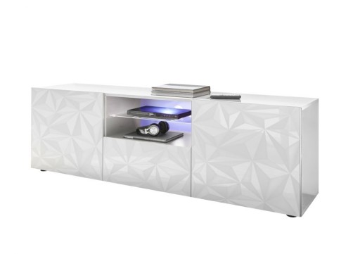 z włoskiej kolekcji mebli Como. Korpus i front wykonane jest z wysokiej jakości płyty lakierowanej na wysoki połysk w kolorze białym. Fronty zdobione wzorem, który nadaje całości nowoczesnego i niepowtarzalnego charakteru. Szafka posiada dwoje drzwiczek, praktyczną szufladę oraz wnękę na sprzęt przedzieloną szklaną półką. Opcjonalnie może zostać wyposażona w oświetlenie LED (opcja dodatkowo płatna).
