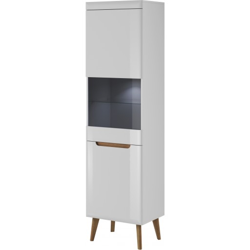Wysoka, wąska witryna z kolekcji Lordi najkorzystniej prezentuje się w zestawieniu z innymi meblami z tej kolekcji. Mebel wykonano w skandynawskiej stylistyce o czym świadczy chociażby jasna kolorystyka. Witrynę zrobiono w białym, błyszczącym kolorze, i wykończono elementami w kolorze dębu riviera. Mebel posiada niewielką część przeszkloną, w której opcjonalnie można zainstalować oświetlenie.