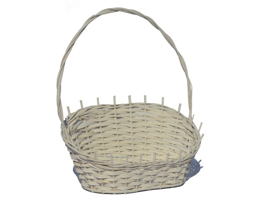 Kosz prezentowy, upominkowy, kosz na kwiaty z wysokim pałąkiem, wykonany z wikliny okorowanej oraz malowany na kolor biały-przecierany.