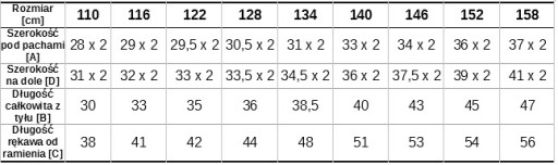 Dostępny w rozmiarach 110 cm - 158 cm.
