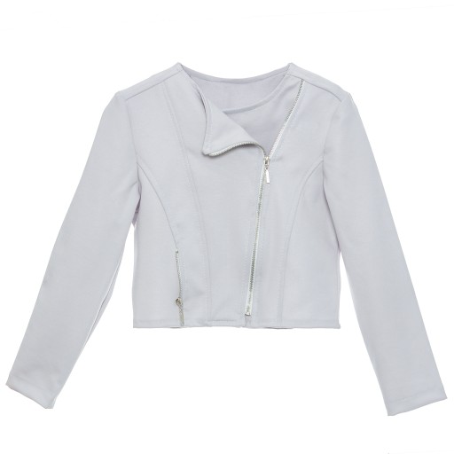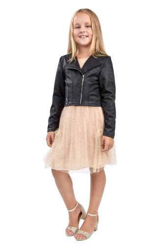 Wykonany jest z naciągającej się tkaniny z lekkim połyskiem imitującej skórę. Zapinany na asymetryczny metalowy zamek w kolorze srebrnym. Z boku ozdobny zamek imitujący kieszonkę. Żakiet ładnie dopasowuje się do sylwetki ponieważ posiada taliowany modny krój. Pasuje do każdej sukienki, spódniczki, spodni.