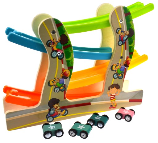 DUŻA DREWNIANA ZJEŻDŻALNIA POCZWÓRNY TOR + 4 AUTKA