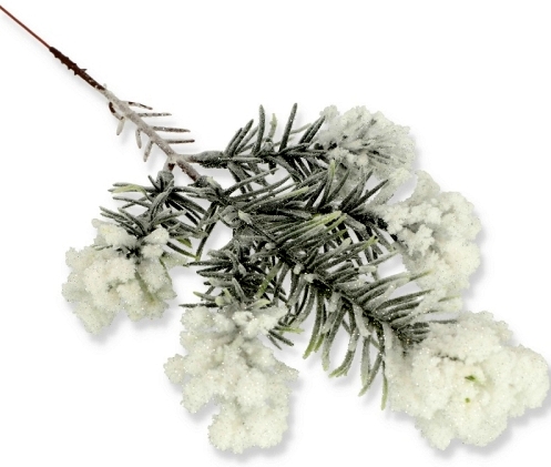 Oferujemy piękną, ośnieżoną, iskrzącą gałązkę świerku o długości całkowitej 26 cm.