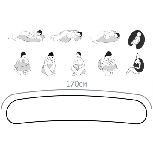 - Odpowiednia długość poduszki 170 cm (+/- 3 cm ) z uwagi na kształt, mierzona jest po łuku (grafika z wymiarem poniżej)