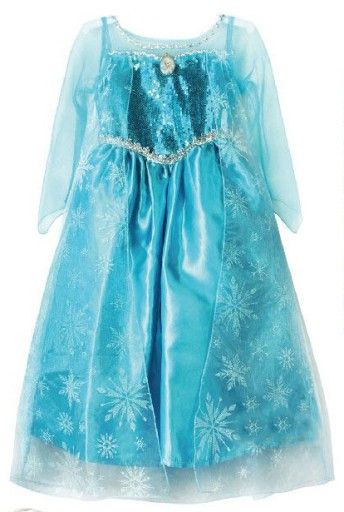 Kostium wiernie odwzorowany na podobieństwo sukni Elsy z filmu. Pięknie i starannie uszyty z połyskujących i błyszczących materiałów. Gorset mieni się niebieskim światłem setek cekinów. Połyskujący szyfonowy klosz sukni pięknie nabiera pełni w tańcu. Rękawy jakby z lodowej mgiełki skrojone tak jak na Elsie. Organzowa peleryna z płatkami śniegu wieńczy całość sylwetki małej królowej lodu.