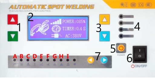 - Wyświetlacz graficzny monochromatyczny (wyświetla tryb pracy zgrzewarki, natężenie prądu zgrzewania,czas zgrzewania, napięcie zasilania