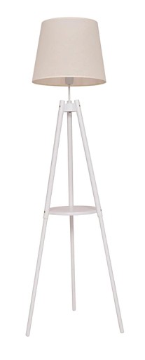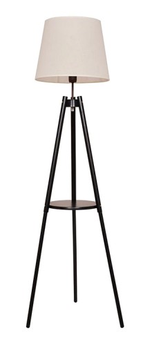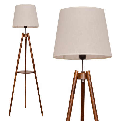 Drewniana stojąca lampa podłogowa trójnóg abażur z półką