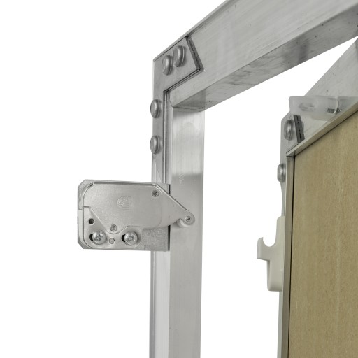 Klapy aluminiowe serii KRAL wykonane są z profili aluminiowych wypełnionych płytą kartonowo-gipsową wodoodporną o grubości 12,5 mm. W klapach zastosowano zamki sprężynowe, dzięki czemu uzyskujemy powierzchnię pozbawioną rączek i uchwytów. Otwarcie klapy następuje po dociśnięciu okolic dłuższej krawędzi części otwieranej.