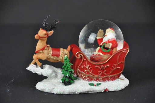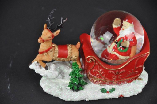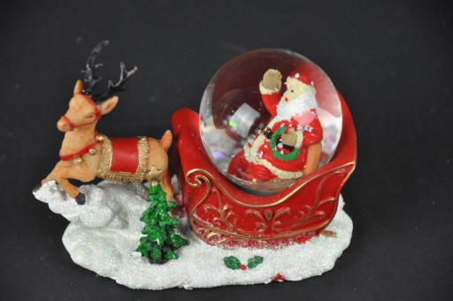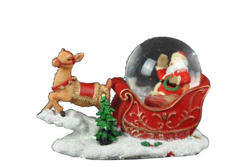 Szklana kula renifer ciągnący sanie z mikołajem w kuli przejrzystym płynem. Po jej lekkim wstrząśnięciu unosi się wokół mikołaja subtelnie mieniący się podczas powolnego opadania brokat. Na pewno przypadnie dzieciom do gustu ta magiczna i niesłychanie fascynująca kula.