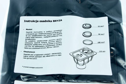 Osadnik montujemy w podłożu pamiętając o zlicowaniu go z ostateczną powierzchnią gruntu. W celu ustabilizowania dno wykopu pod osadnik należy wylać betonem, następnie połączyć rurę kanalizacyjną. Po ustaleniu ostatecznego poziomu gruntu oblewamy osadnik kolejną warstwą betonu. Następnie podłączamy rurę spustową o średnicy 110mm. Po zastosowaniu opcjonalnych redukcji możemy również podłączyć rury o średnicach: 63mm, 90mm i 100mm.