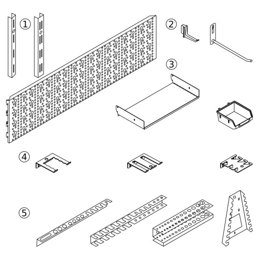 - 3) akcesoria - wpinamy w płyty perforowane dowolnie w zależności od potrzeb (na infografice pokazano także akcesoria opcjonalne)