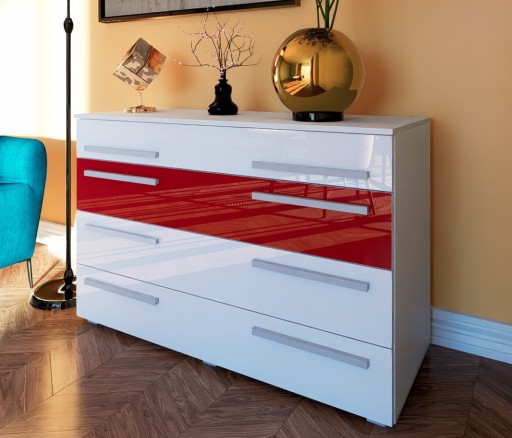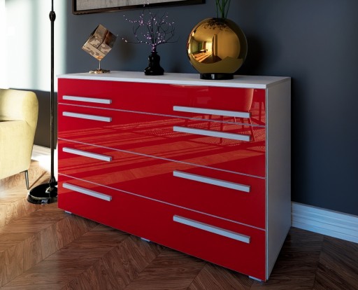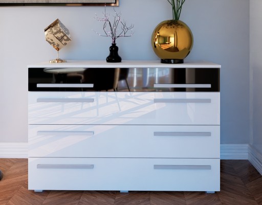 - Korpus komody wykonany z płyty laminowanej o grubości 16 mm