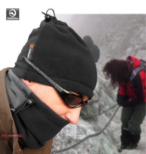 HORNHILL PERU posiada w górnej części gumo-sznurek (ze stoperkiem) po mocnym jego ściągnięciu i zawinięciu (pokazane jest to na jednym z poniższych zdj.) tworzy się czapka. Gumo-sznurek pozwala również regulować objętość kołnierza na szyi. Kołnierzo-czapka jest przeznaczona na głowy w rozm. : 55 cm.-61 cm.
