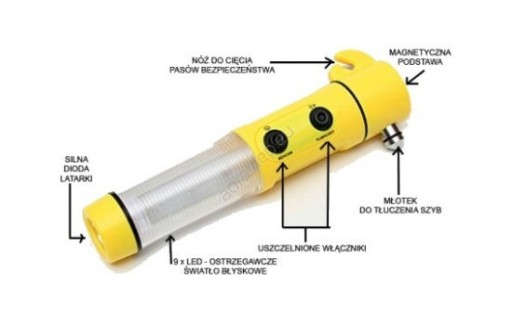 (latarka, nóż do przecinania pasów, młotek do rozbijania szyb i sygnalizator świetlny)Zasilanie: 2x AA baterie (brak w zestawie)