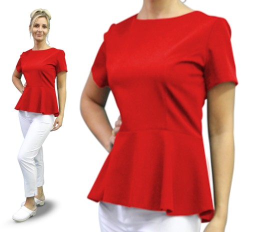 Fartuch z krótkim rękawem posiada prosty dekolt w łódkę i delikatne zapięcie na suwak z tyłu.