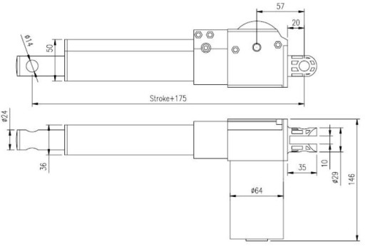 Wymiary siłownika gdzie STROKE oznacza wysuw danego siłownika w mm (np. 300mm) czyli dlugosc SCHOWANEGO siłownika (model 300mm) to 300+175 = 475 mm. Natomiast na pełnym wysunięciu będzie miał długość 475 + 300 (wysuw) czyli 775mm. Oczywiście wymiary podano z pewna tolerancja.