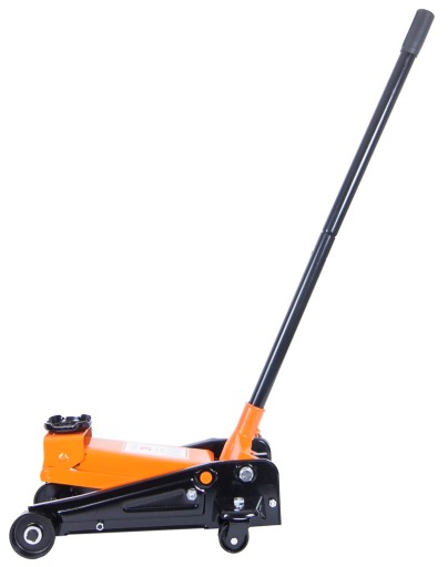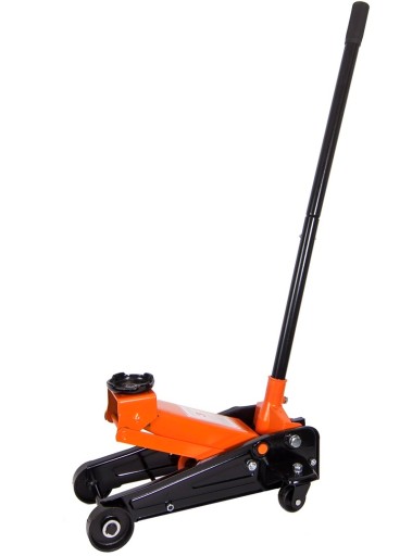 Praktyczny podnośnik samochodowy, wyposażony w koła jezdne, dzięki czemu łatwo się go przemieszcza.