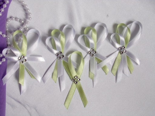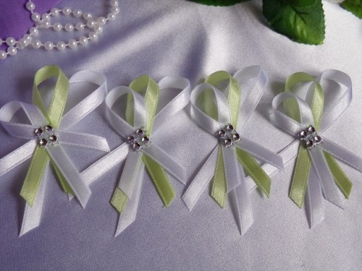 * 4 szt kotylionów dla świadków, rodziców, wykonanych z jednej kolorowej i dwóch białych wstążek oraz ozdobnych kryształów.