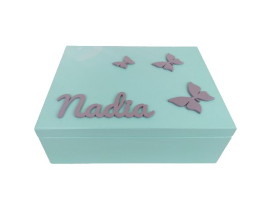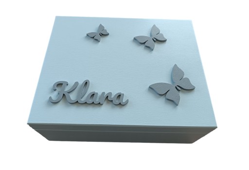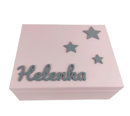 Piękna, pojemna skrzyneczka z imieniem. Ręcznie malowana z zewnątrz farbą i lakierem. W środku nie malowana. Pomieści wszelkie spineczki, gumeczki czy inne skarby. Dostępna w kolorze pastelowy róż, biały, szary, pastelowy niebieski, miętowy.