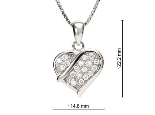 Przedmiotem aukcji jest uroczy srebrny komplet: fantazyjny wisiorek w kształcie stylizowanego serduszka z cyrkoniami oraz łańcuszek. Naszyjnik - zawieszka i łańcuszek - w całości wykonany jest z rodowanego srebra. Warstwa twardego, szlachetnego rodu zabezpiecza srebro przed oksydowaniem (ciemnieniem) i rysowaniem się powierzchni.