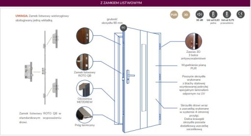 skrzydło drzwiowe, ościeżnicę termiczną,zamek listwowy, klamkę , wkładkę, zestaw uszczelek, rozetę,próg termiczny