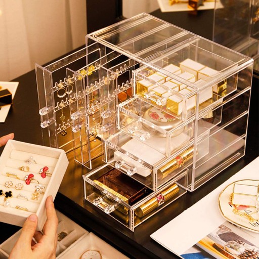 Jewellery Organiser Storage Box Acrylic: Large Earring Holder Display Stand Boxes with 4 Clear Drawers - Transparent Plastic Dustproof Earrings Case Rack See Through Ring Makeup Necklace Stud Bracelet
