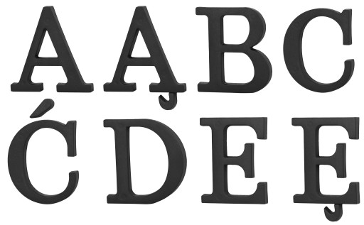 od 0 do 9 w trzech kolorach do montażu na ścianach. Tylko u nas dostępny jest cały alfabet wraz z ogonkami i kropkami dostępny w dwóch kolorach czarnym i brązowym, oraz w kolorze złotym litery A, B, C, D.