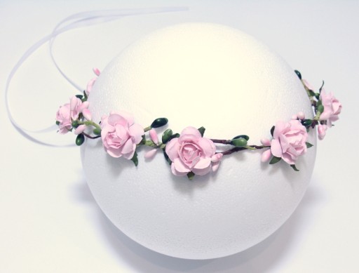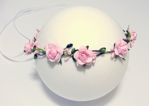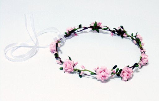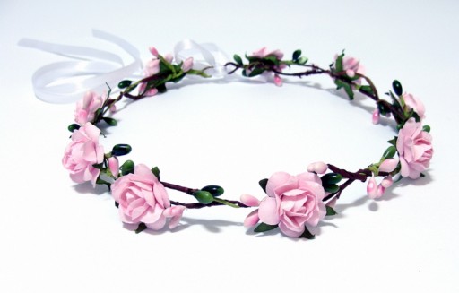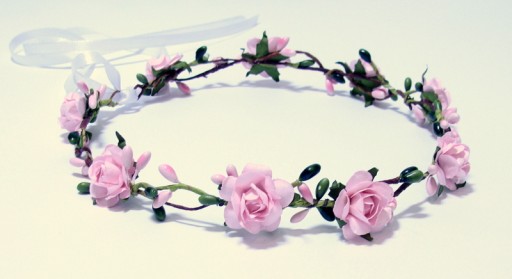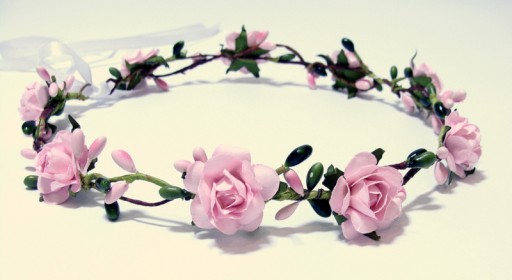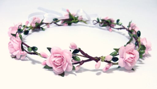 Wianek zdobiony kwiatkami, które doskonale imitują żywe rośliny. Kompozycja w kolorach różowym i zielonym.