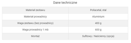- Dostępne produkty uzupełniające: klamry mocujące prowadnicę do ściany, domykacz, uchwyty maskownicy drewnianej lub maskownica aluminiowa z zaślepkami bocznymi (w przypadku mocowania do ściany), maskownica aluminiowa paska (montaż maskownicy płaskiej możliwy również w przypadku prowadnicy mocowanej do sufitu, należy zastosować tulejki dystansowe)