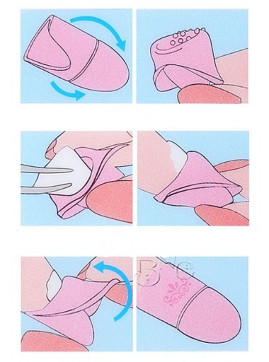 Namoczony uprzednio w acetonie wacik wkładamy do środka silikonowego naparstka, następnie nakładamy na paznokieć. Po 5-10 minutach ściągamy z paznokci.