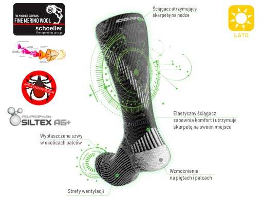 Wygodne skarpety trekingowe wykonane z włókna australijskich owiec Merynosów z domieszką poliestru SILTEX AG+ zawierającego jony srebra.