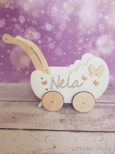 Wózek kolor biały+ naturalne dodatki + motylki + personalizacja