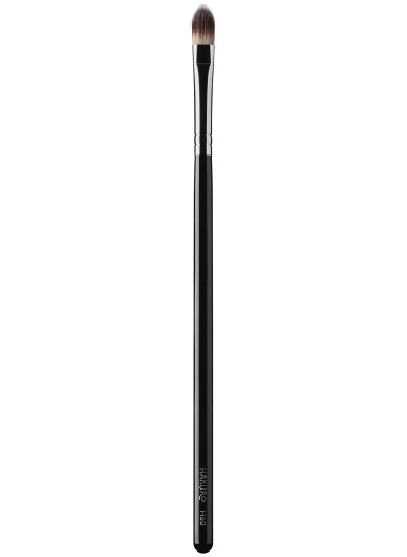 Pędzel do makijażu H60 marki Hakuro. Ze względu na swe małe kształty stanowi idealne narzędzie do rozprowadzania wszelkich korektorów - zarówno tych płynnych, jak i kremowych. Pozwoli precyzyjnie zaaplikować kosmetyk nawet w najmniejszych partiach twarzy. Wykonany został z wysokiej jakości elastycznego i niezwykle giętkiego dwukolorowego włosia syntetycznego, które ułożono w lekko spłaszczonej skuwce. Pędzel nie pozostawia nieestetycznych smug, jest łatwy w utrzymaniu czystości i użytkowaniu. Nawet w najmniej doświadczonych rękach pozwoli osiągnąć rewelacyjne efekty. Rączka drewniana, pomalowana na czarno wraz ze srebrną skuwką tworzą estetyczną całość.