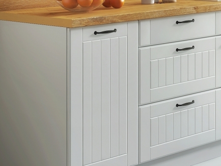 Fronty z charakterystycznym frezowaniem prezentują się bardzo dekoracyjnie. Witryny z ozdobnymi szprosami podkreślają wyjątkowy charakter kolekcji. Dopełnienie stylizacji stanowią efektowne uchwyty zastosowane w szafkach dolnych i gałki w szafkach górnych.