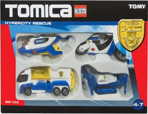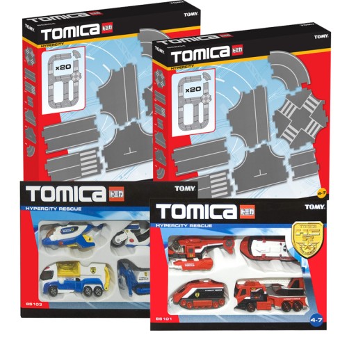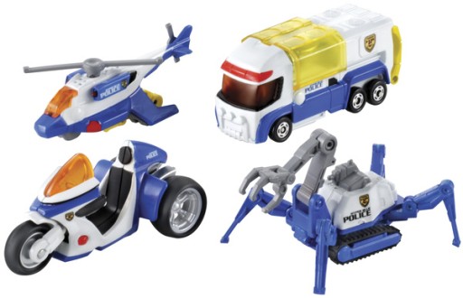 Pojazdy policji z linii Hypercity Rescue z serii Tomica do rozbudowy miasta. Pojazdy posiadają niektóre elementy ruchome. W skład kompletu wchodzą elementy:
