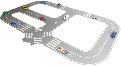 Elementy jezdni dla samochodów z serii Tomica do rozbudowy miasta. Wykonane z wysokiej jakości laminowanej tektury elementy ulic w kolorze szarym wraz z namalowanym podziałem drogi, pasami dla pieszych.