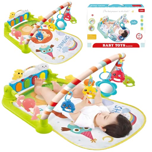 - mata ma przymocowany pałąk z kolorowymi grzechotkami i lusterkiem, leżąc dziecko może stópkami grać na pianinie
