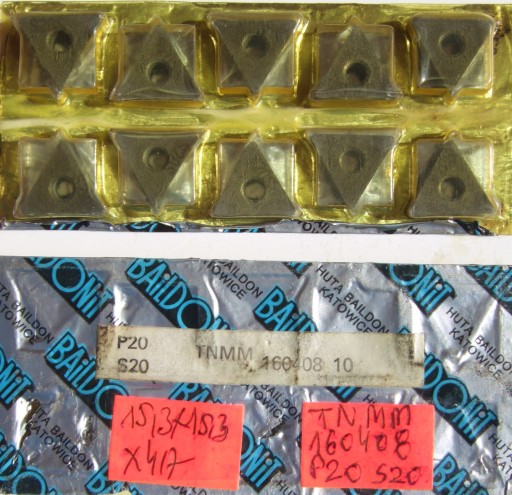 Płytki Płytka wieloostrzowe do noży tokarskich - głowic firmy Baildonit itp. Trójkątne z dziurką: TNMM 160408 P20 S20 (15,3x15,3x4,7) cena 9. --- TNMM 160408 S10S cena 9. --- TNMM 160412 S10S P10 Wymiar Wys 8,1 Grub 4,8 cena 9.